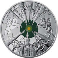На реверсі монети розміщено композицію, що символізує реліктовий ліс: угорі і внизу, з ракурсу погляду людини вгору, зображено дерева, вершини яких тягнуться до жовто-зеленого кола (використано тамподрук) у центрі монети, що символізує листя та сонце; ліворуч і праворуч – коні з вершниками, які символізують визвольну боротьбу часів гайдамаччини та Холодноярської Республіки; унизу серед дерев ? Троїцька церква Мотронинського монастиря.