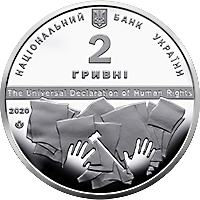 На аверсі монети розміщено: малий Державний Герб України (угорі) та написи: НАЦІОНАЛЬНИЙ (ліворуч від герба), БАНК УКРАЇНИ (праворуч від герба), 2/ ГРИВНІ (під гербом), THE UNIVERSAL DECLARATION OF HUMAN RIGHTS (по центру); ліворуч – рік карбування монети – 2020, під яким – логотип Банкнотно-монетного двору Національного банку України; унизу на тлі аркушів паперу – руки та суддівський молоток (як символ прийняття суддівських рішень).