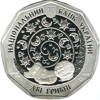 На аверсі монети розміщено: угорі малий Державний Герб України, написи: угорі півколом - НАЦІОНАЛЬНИЙ БАНК УКРАЇНИ, унизу - номінал ДВІ ГРИВНІ та стилізовану композицію - на тлі зіркового неба зображення знаків зодіаку, під якими на місяці солодко спить дитина; рік карбування монети 2015 та логотип Монетного двору Національного банку України (праворуч), позначення металу, проби та маси Ag 925/7,78 (ліворуч).