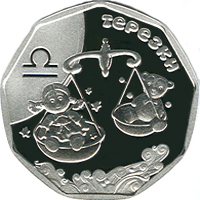 На реверсі монети зображено стилізовану композицію - ліворуч на матовому тлі символ знака зодіаку Терезів, у центрі над травою - терези на яких сидять іграшки: лялька (ліворуч) та ведмежатко (праворуч), угорі напис - ТЕРЕЗКИ.