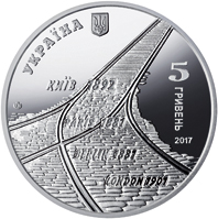 На аверсі монети розміщено: угорі малий Державний Герб України, ліворуч півколом напис - УКРАЇНА, праворуч - номінал 5 ГРИВЕНЬ (вертикальний напис) та рік карбування монети 2017; стилізовану композицію: на бруківці розміщена трамвайна колія, спрямована вгору як символ руху до прогресу, та написи: КИЇВ 1892/PARIS 1881/BERLIN 1881/LONDON 1901; логотип Банкнотно-монетного двору Національного банку України (унизу ліворуч).