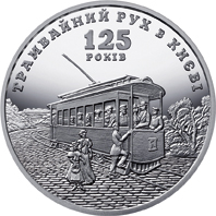 На реверсі монети зображено трамвай з пасажирами на тлі київського пейзажу та угорі півколом розміщено написи ТРАМВАЙНИЙ РУХ В КИЄВІ/125/РОКІВ.