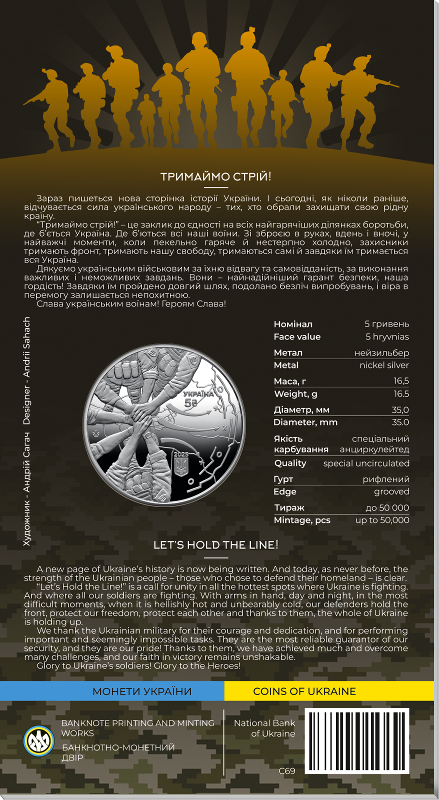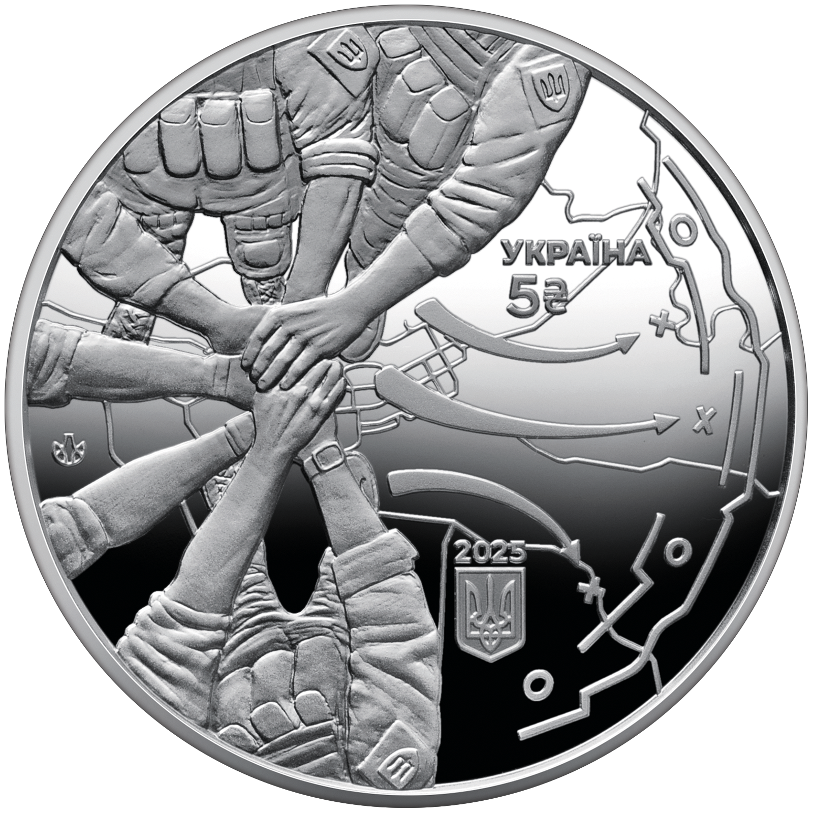 На аверсі монети на дзеркальному тлі зображено українських захисників, які поєднали руки в колективному рукостисканні в колі єдності. Ця композиція підкреслює згуртованість перед боєм, готовність до захисту рідної землі. На задньому тлі схематично зображено топографічну мапу місцевості з позначеними на ній лініями оборони і напрямками бойових дій, що візуально нагадують тризуб. Праворуч розміщено напис УКРАЇНА, номінал 5 та графічний символ гривні, рік карбування 2025 і малий Державний Герб України. Ліворуч зазначено логотип Банкнотно-монетного двору Національного банку України.
