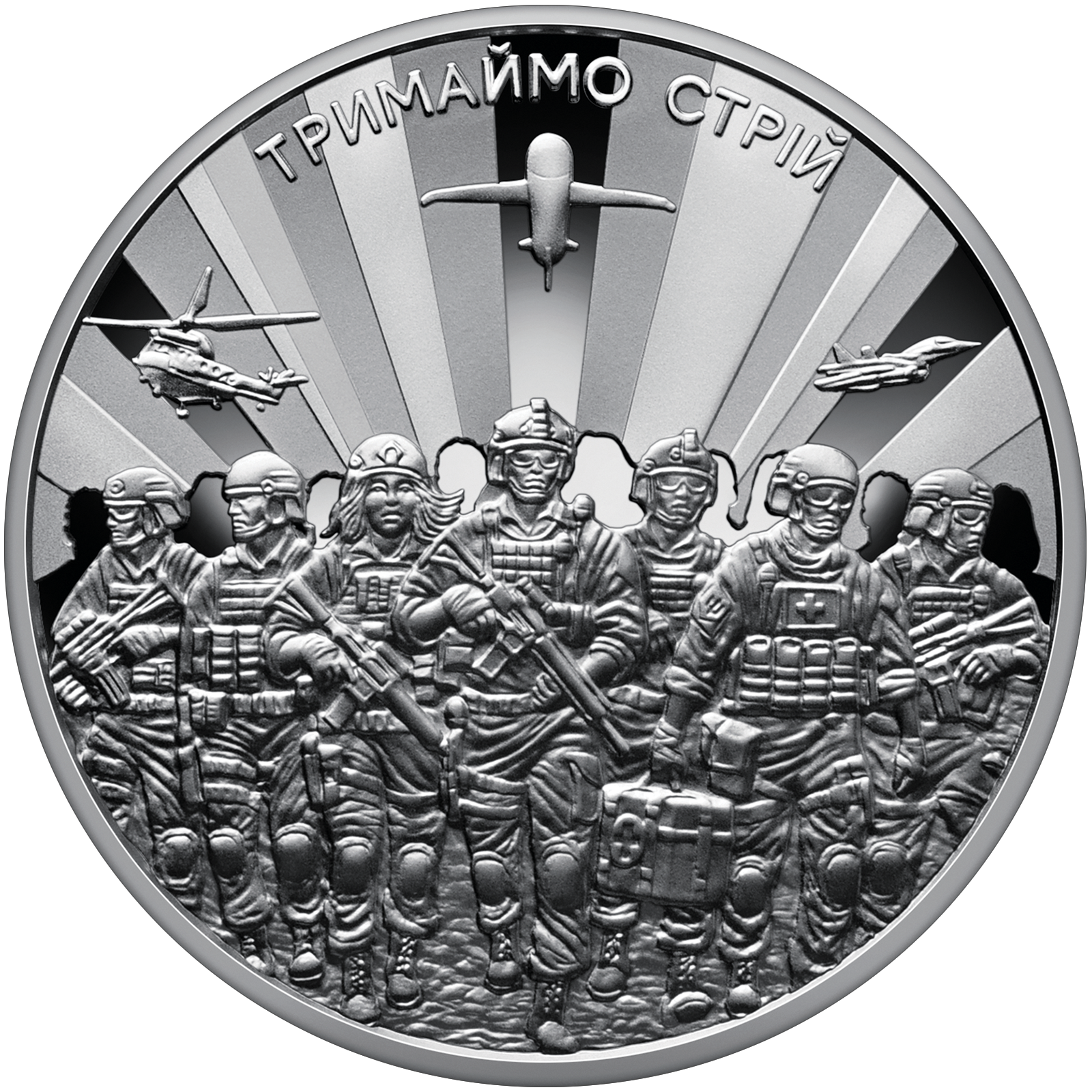 На реверсі монети продовжено тематику аверсу – зображені воїни, які впевнено йдуть уперед. У верхній частині монети півколом розміщено напис ТРИМАЙМО СТРІЙ та стилізовані зображення військового гелікоптера, літака і безпілотника, що уособлюють силу та міць українського війська. За спинами воїнів – надійний тил, представлений силуетами цивільних людей, які щоденно працюють, допомагають і донатять заради спільної перемоги.