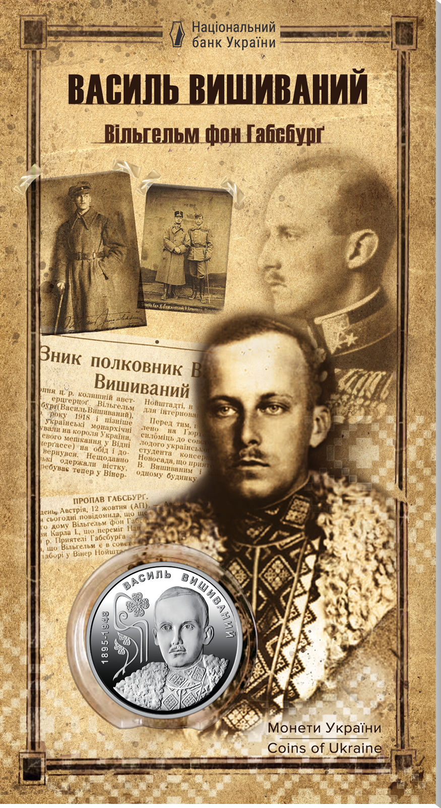 Пам’ятна монета присвячена Вільгельму Францу фон Габсбурґу-Лотрінґену (1895–1948) – представнику європейської аристократії, який увійшов в історію України під псевдонімом Василь Вишиваний. Ерцгерцог австрійський, полковник легіону Українських січових стрільців, поет, дипломат, державний діяч – він був яскравим і непересічним учасником українських визвольних змагань початку ХХ століття. Займаючи визначне місце як на військовому фронті, так і в міжнародних дипломатичних колах, Василь Вишиваний усією своєю діяльністю утверджував ідеали незалежної, соборної України. Завдяки його активній участі Австро-Угорська імперія стала однією з перших країн, що офіційно визнала Українську Народну Республіку.