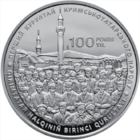 На реверсі монети на тлі будівель мечеті зображено делегатів кримськотатарського національного з`їзду та по колу написи українською та кримськотатарською мовами: 100 РОКІВ/ (над будівлею праворуч), ПЕРШИЙ КУРУЛТАЙ КРИМСЬКОТАТАРСЬКОГО НАРОДУ.