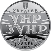 На аверсі монети розміщено: малий Державний Герб України, під яким напис УКРАЇНА; у центрі на дзеркальному тлі ? шрифтова композиція з абревіатур УНР/ЗУНР, літери яких декоровані характерними орнаментами; унизу на матовому тлі ? номінал 5/ ГРИВЕНЬ, по боках від якого ? стилізований рослинний орнамент, рік карбування монети 2019 (унизу); логотип Банкнотно-монетного двору Національного банку України (праворуч на дзеркальному тлі).