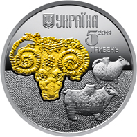 На аверсі монети розміщено: угорі малий Державний Герб України, праворуч від якого напис УКРАЇНА, під ним номінал 5/ГРИВЕНЬ та рік карбування монети 2019; у центрі – позолочене зображення металевого рельєфу із зображенням голови барана (Північне Причорномор’я), праворуч від якого – пам’ятки сарматської археологічної культури: дві керамічні посудини у вигляді баранів з могильника Нейзац, що в Криму.