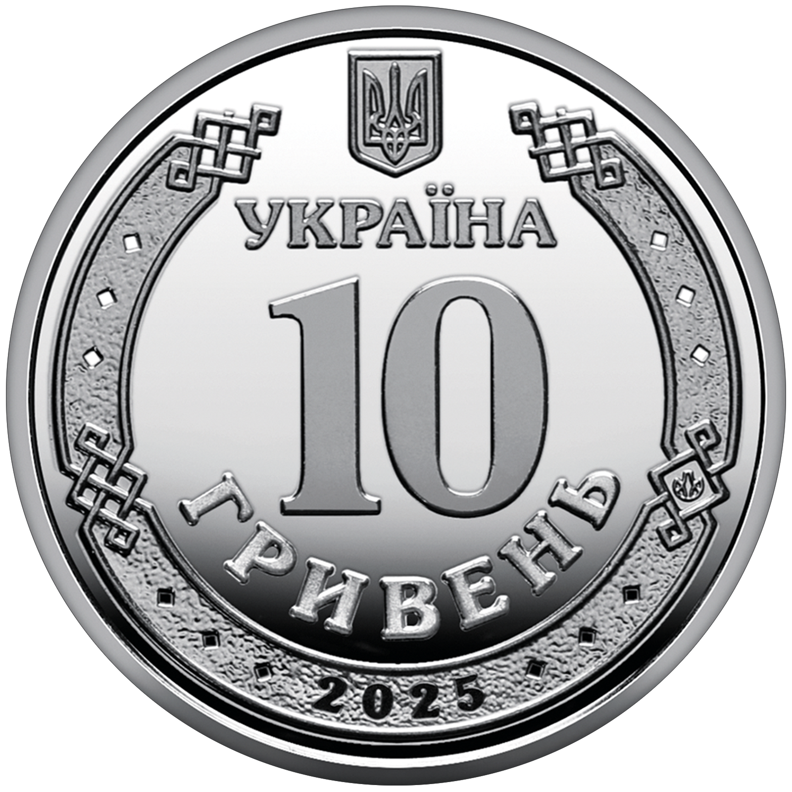 На аверсі монети зображено малий Державний Герб України (угорі); в обрамленні давньоруського орнаменту по центру розміщено написи: УКРАЇНА / 10 / ГРИВЕНЬ (півколом); на тлі орнаменту зазначено рік карбування монети – 2025 (унизу) та логотип Банкнотно-монетного двору Національного банку України (праворуч).