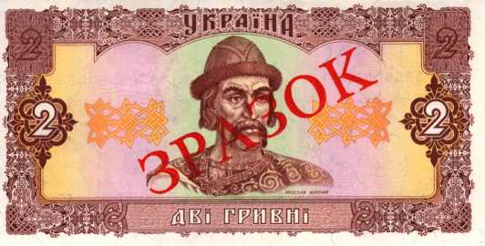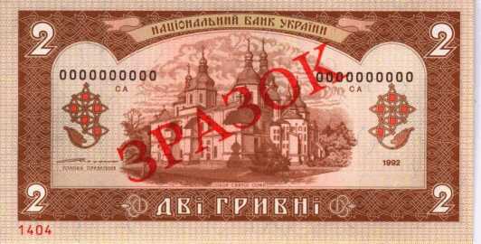 Áàíêíîòà íîì³íàëîì 2 ãðèâåíü 1992 ðîêó âèãîòîâëåííÿ. ϳäïèñ "Þùåíêî", "Çðàçîê".