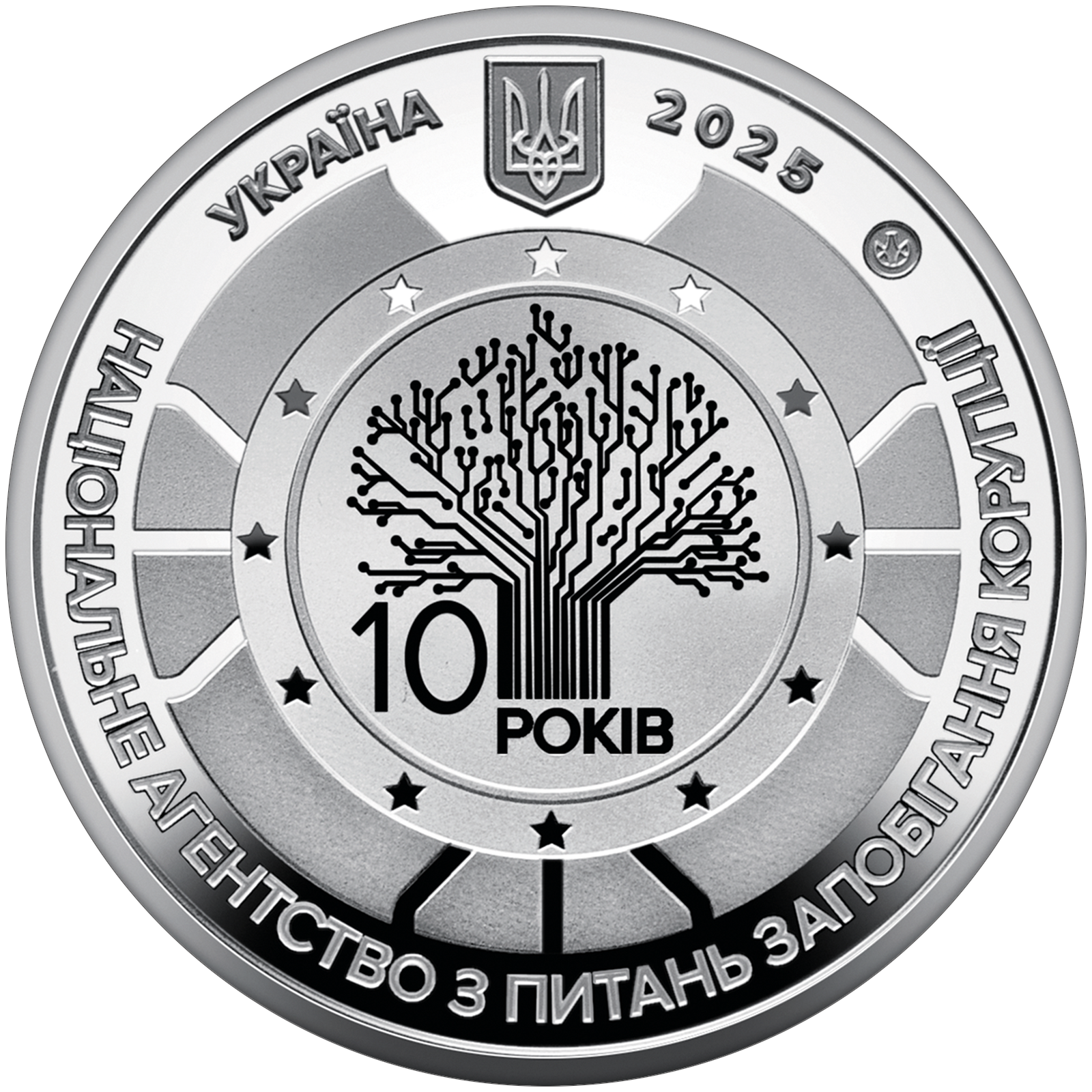 На аверсі медалі в центрі композиції розміщено стилізоване дерево, яке складається з елементів мікросхеми, що символізує дані, які збирає, аналізує та адмініструє НАЗК за допомогою своїх порталів та реєстрів, а також розвиток, зростання, цифровізацію, сучасні технології та інноваційність у роботі НАЗК. Під зображенням дерева міститься напис 10 РОКІВ, що свідчить про десятиріччя з часу створення НАЗК. Навколо центральної композиції зображено: зірки, які відображають епоху активної інтеграції України з Європейським Союзом та роль НАЗК у наближенні законодавства України до міжнародних стандартів; стилізований індикатор “від темряви до світла”, що символізує динаміку зниження рівня корупції в країні та суспільстві; напис НАЦІОНАЛЬНЕ АГЕНТСТВО З ПИТАНЬ ЗАПОБІГАННЯ КОРУПЦІЇ (півколом). У верхній частині аверсу, над композицією, розміщено напис УКРАЇНА, малий Державний Герб України та рік карбування медалі – 2025. Праворуч від головної композиції зазначено логотип Банкнотно-монетного двору Національного банку України.